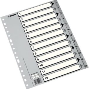 Esselte Busta da 50 Indici Numerici in Plastica – Schede da 1 a 12 – Multiforo – Formato A4 – Colore Grigio