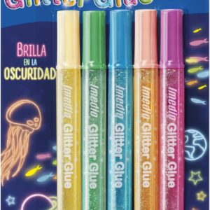 Imedio Colla Glitter Glow in the Dark Confezione da 5 Tubi di Colla Glitter 10ml – Si Illumina al Buio – Per Diversi Materiali – Tubo Extra Morbido – Ugello di Precisione – Senza Solventi – Colori Assortiti