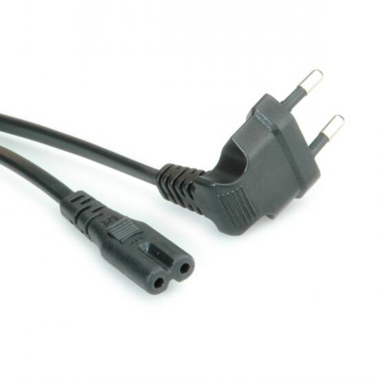 Cavi di alimentazione, Euro 90° – C7. Questo cavo di alimentazione, noto anche come Euro 8, ? utilizzato per collegare i dispositivi Home Entertainment come TV, monitor, radio, mangianastri, radioregistratori e altri dispositivi simili alla rete elettrica. Il connettore a 90° occupa molto meno spazio del normale connettore dritto. Quindi questo cavo ? l&#39-ideale da usare dietro alle TV piatte, che spesso sono installate su staffe a muro con poco spaizio a disposizione, e in ogni altra situazione simile. Il connettore C7 ? reversibile, quindi si pu? utlizzare in ambediue i sensi. CARATTERISTICHE: Specifiche cavo H03VVH2-F 0,75mm Connettore 1: Euro (CEE 7/16), Spina Connettore 2: IEC C7, Presa 90° Carico di corrente: 250V/2,5A Sezione dei conduttori 0,75 mm Colore cavo: Nero Colore connettori: Nero