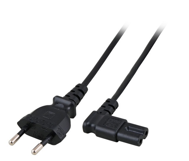 Cavi di alimentazione, Euro – C7 inclinato laterale 90°. Il connettore a 90° occupa molto meno spazio del normale connettore dritto. Quindi questo cavo ? l'-ideale da usare dietro alle TV piatte, che spesso sono installate su staffe a muro con poco spaizio a disposizione, e in ogni altra situazione simile. Il connettore C7 ? reversibile, quindi si pu? utlizzare in ambediue i sensi. Questo cavo di alimentazione, noto anche come Euro 8, ? utilizzato per collegare i dispositivi Home Entertainment come mangianastri/radioregistratore alla rete elettrica. CARATTERISTICHE: Specifiche cavo H03VVH2-F 0,75mm Connettore 1: Euro (CEE 7/16), Spina Connettore 2: IEC C7, Presa Carico di corrente: 250V/2,5A Sezione dei conduttori 0,75 mm Colore cavo: Nero Colore connettori: Nero