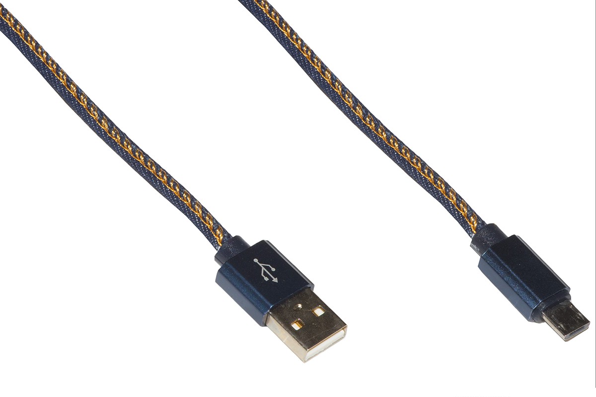 Cavo Micro USB per alimentazione e scambio dati di smartphone e tablet. Anche per caricatori a ricarica rapida, assicura una ricarica veloce del dispositivo. Connettori con custodia con protezione antirottura nel punto di attacco, colore blu. Si possono collegare e scollegare minimizzando il rischio di rottura. Guaina in tela Denim, molto resistente con design molto ricercato e unico, non ? il solito cavo bianco o nero. Vorrete ricaricare lo smartphone anche quando non ce n&#39-? bisogno! Riconoscerete il vostro cavo tra tutti gli altri. Con laccio di chiusura a bottone. Lunghezza mt 1 Connettore 1: Micro USB maschio Connettore 2: USB A Maschio