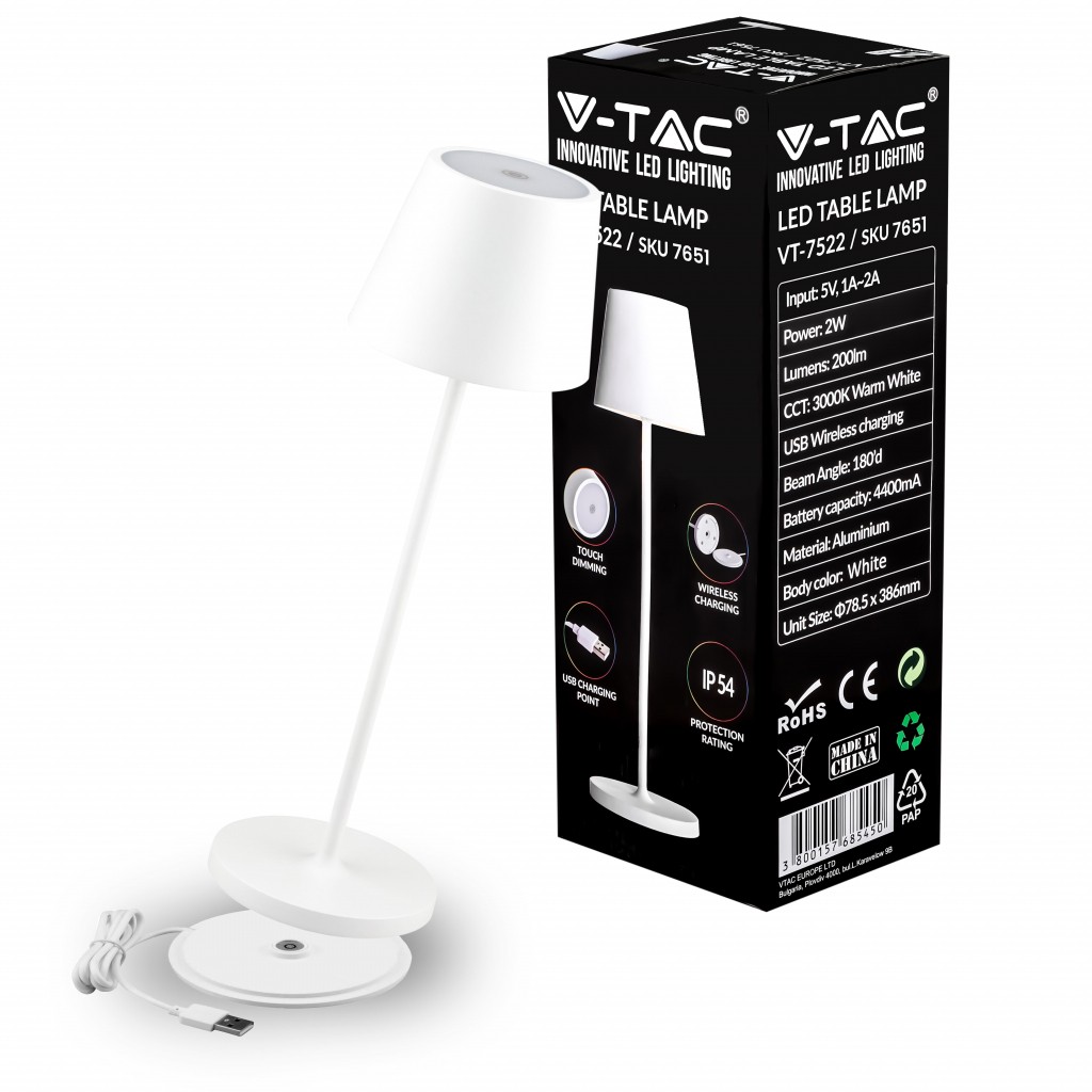 V-TAC Lampada LED da Tavolo 2W Colore Bianco in Alluminio con caricatore Wireless e Touch Dimmerabile 3000K IP54